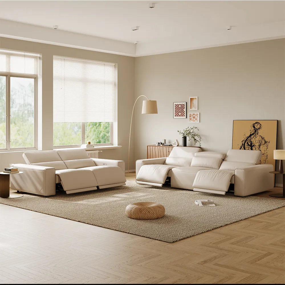 125in Modern and stylish eco-friendly genuine leather sofa with rotatable armrests and adjustable headrests.