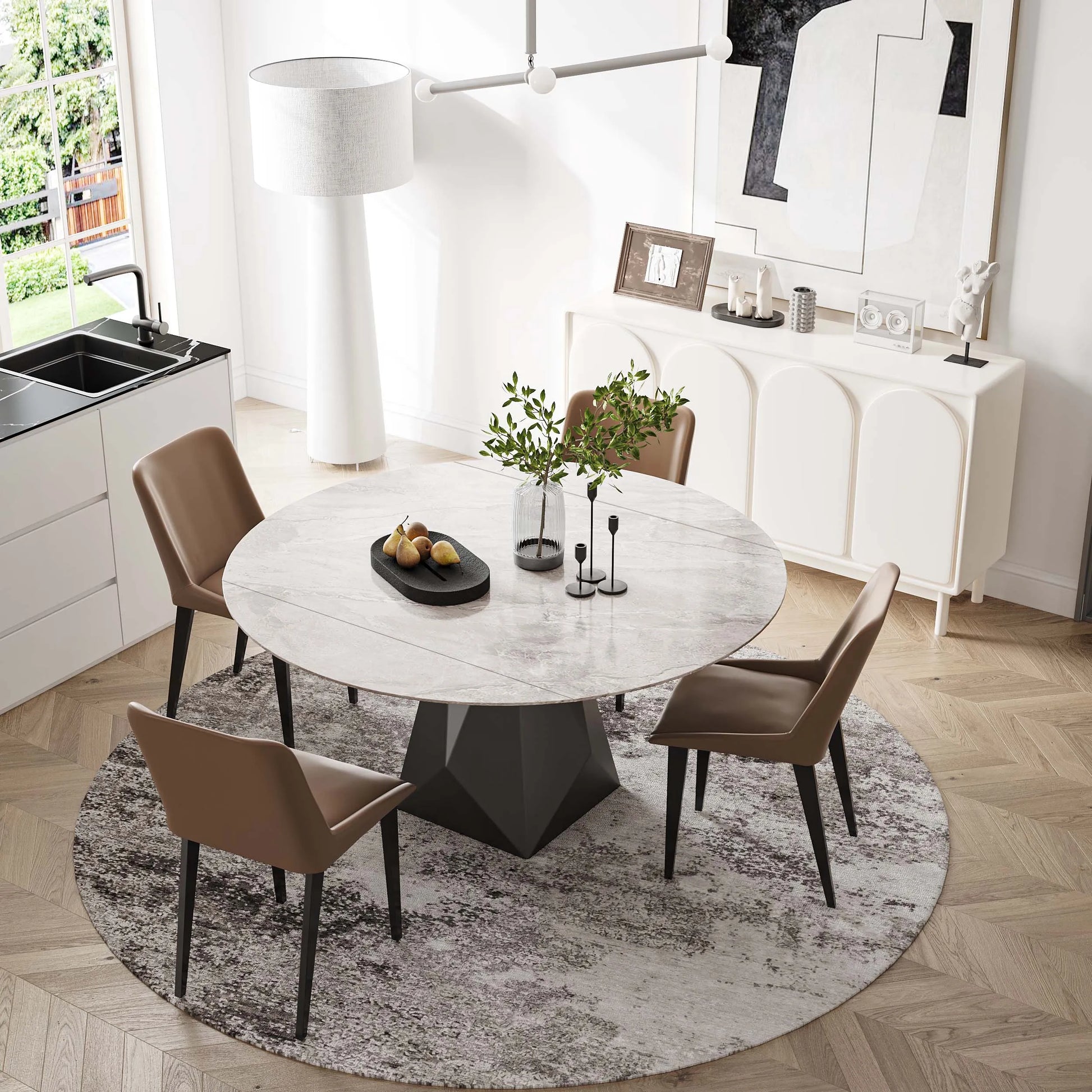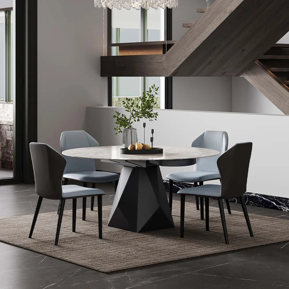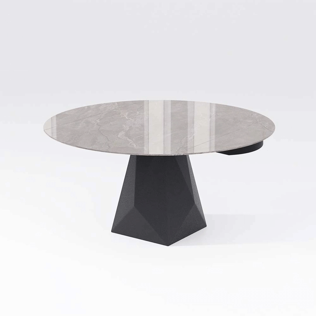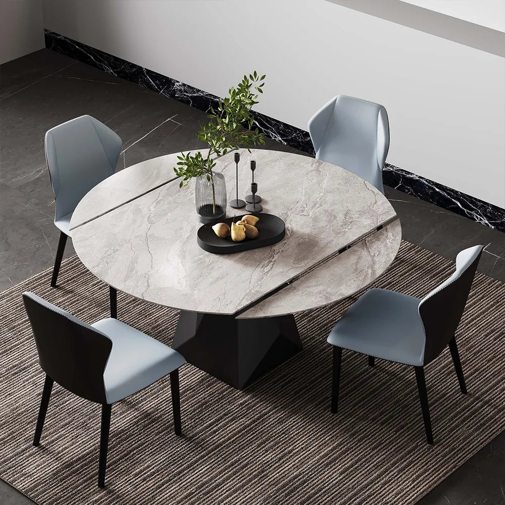 This modern light luxury round glossy sintered stone dining table has a extendable function for different space sizes, which can save space for the dining room. The carbon steel legs are not only solid and safe, but also durable, providing solid support for the table. The table top is designed with a gray pattern and dark gray steel legs, highlighting the noble and elegant tone of the dining room.