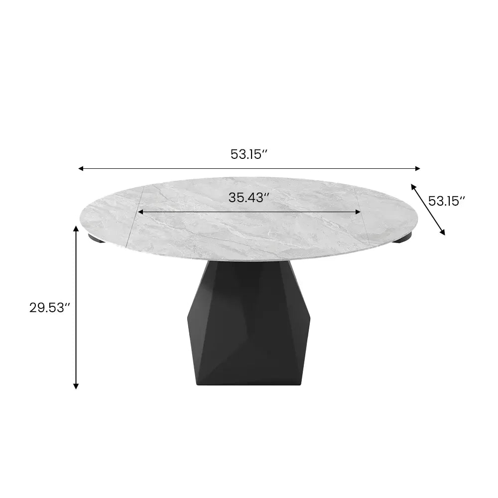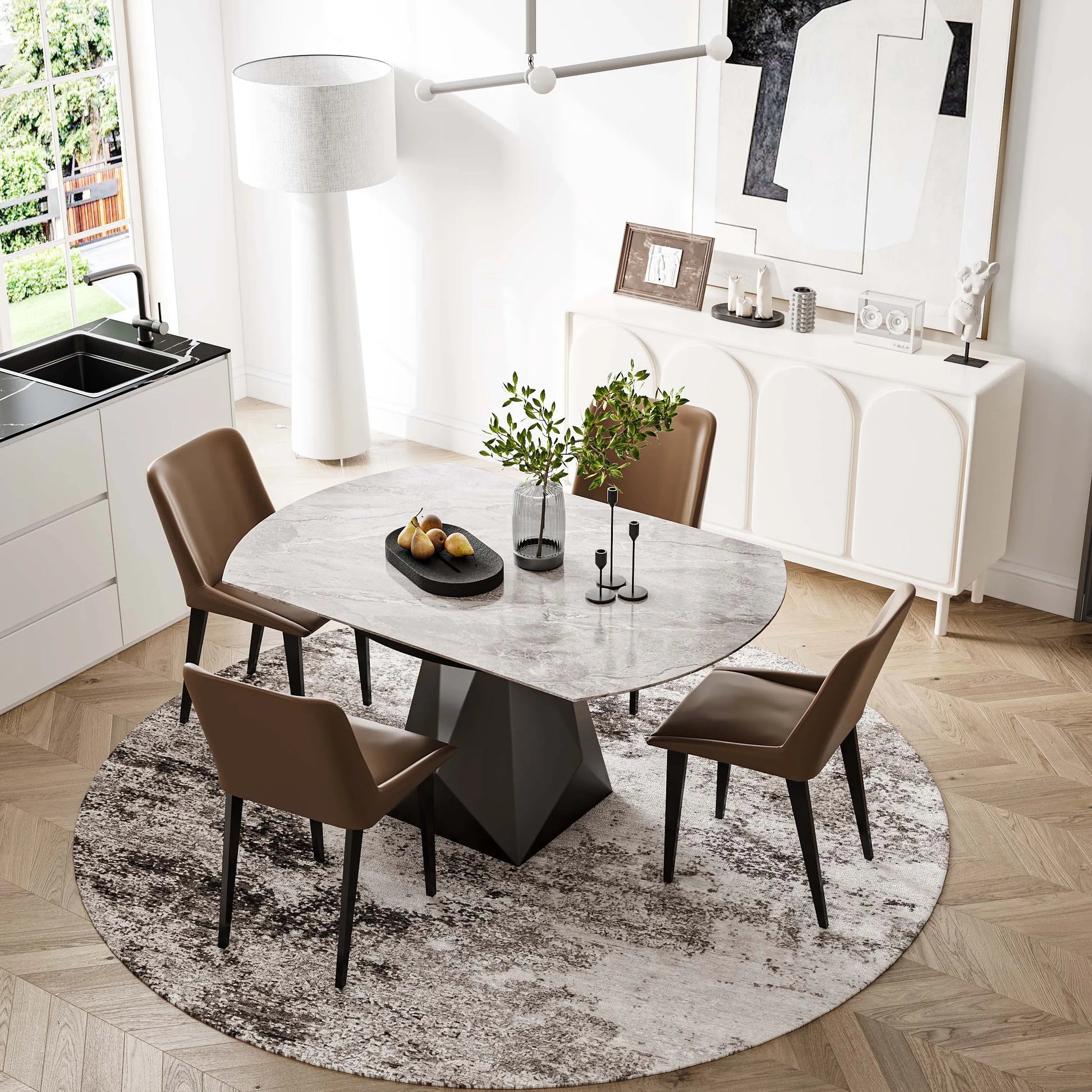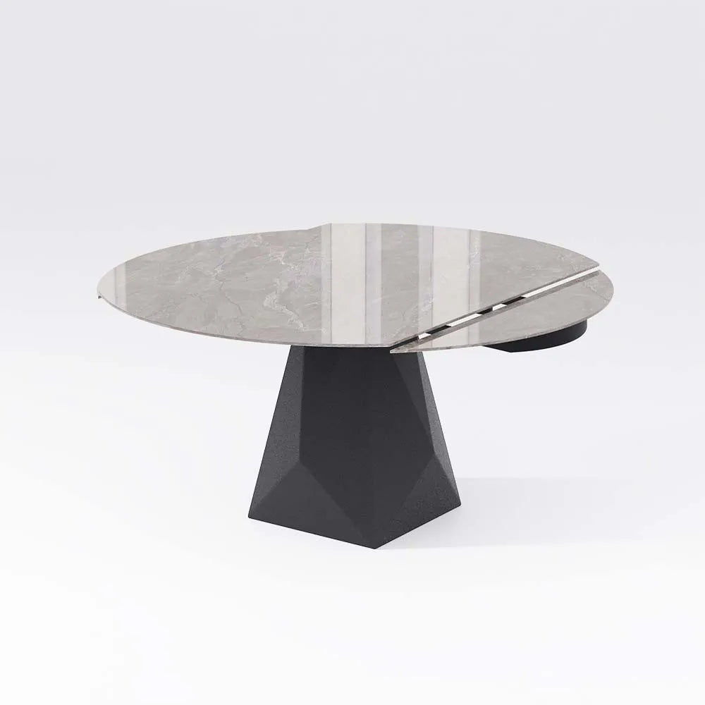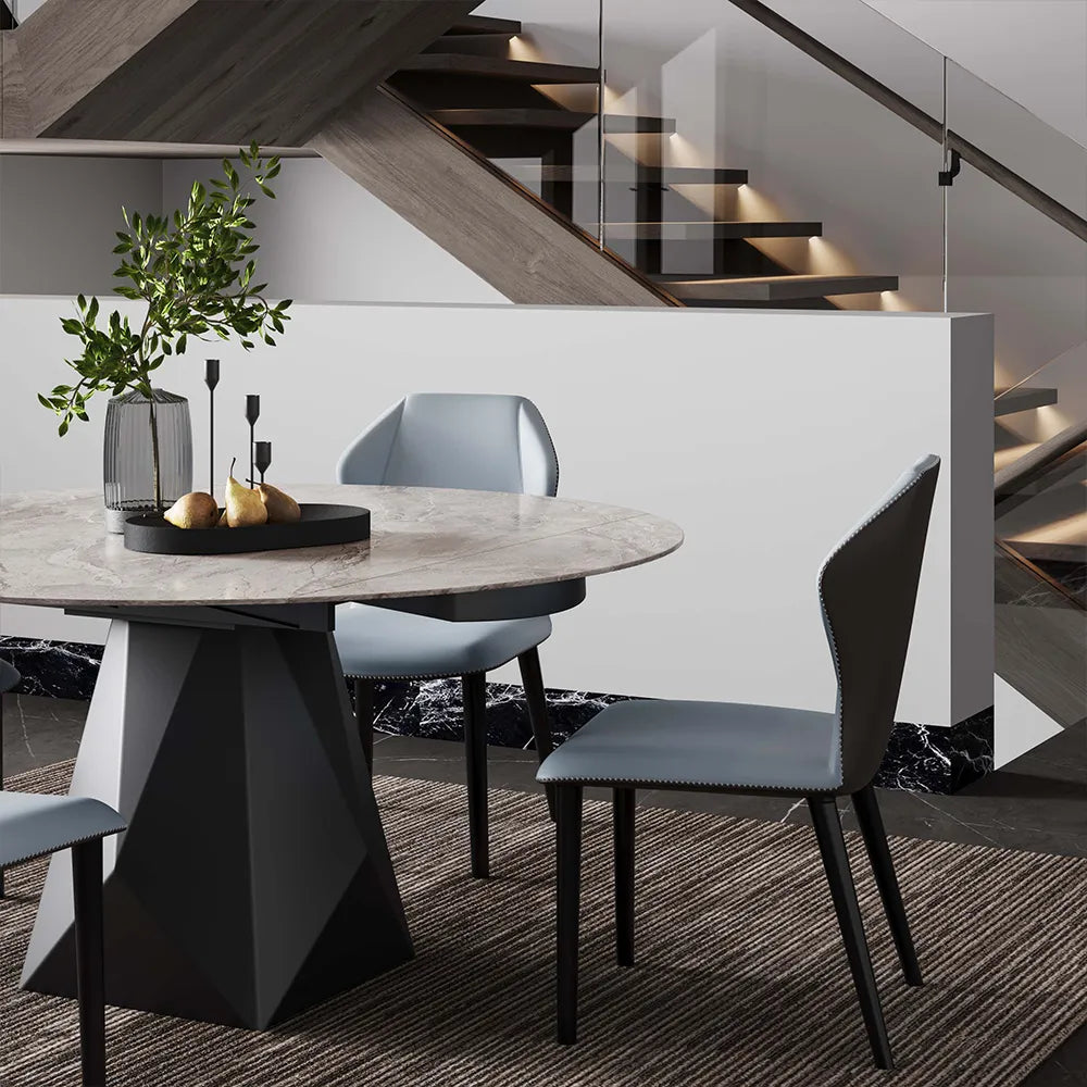 This modern light luxury round glossy sintered stone dining table has a extendable function for different space sizes, which can save space for the dining room. The carbon steel legs are not only solid and safe, but also durable, providing solid support for the table. The table top is designed with a gray pattern and dark gray steel legs, highlighting the noble and elegant tone of the dining room.