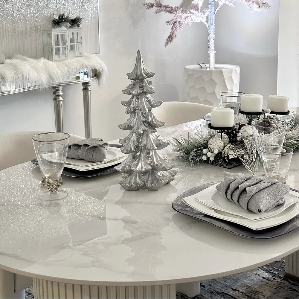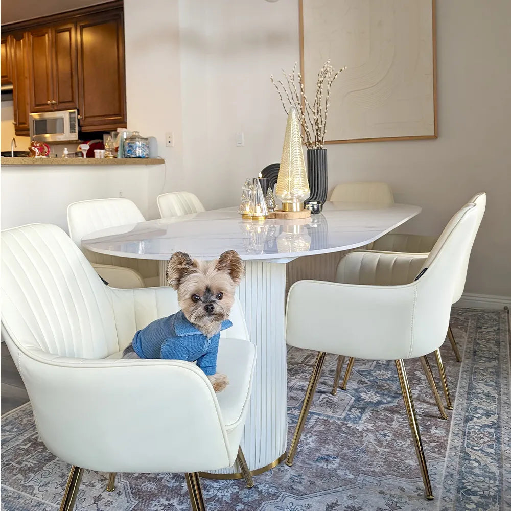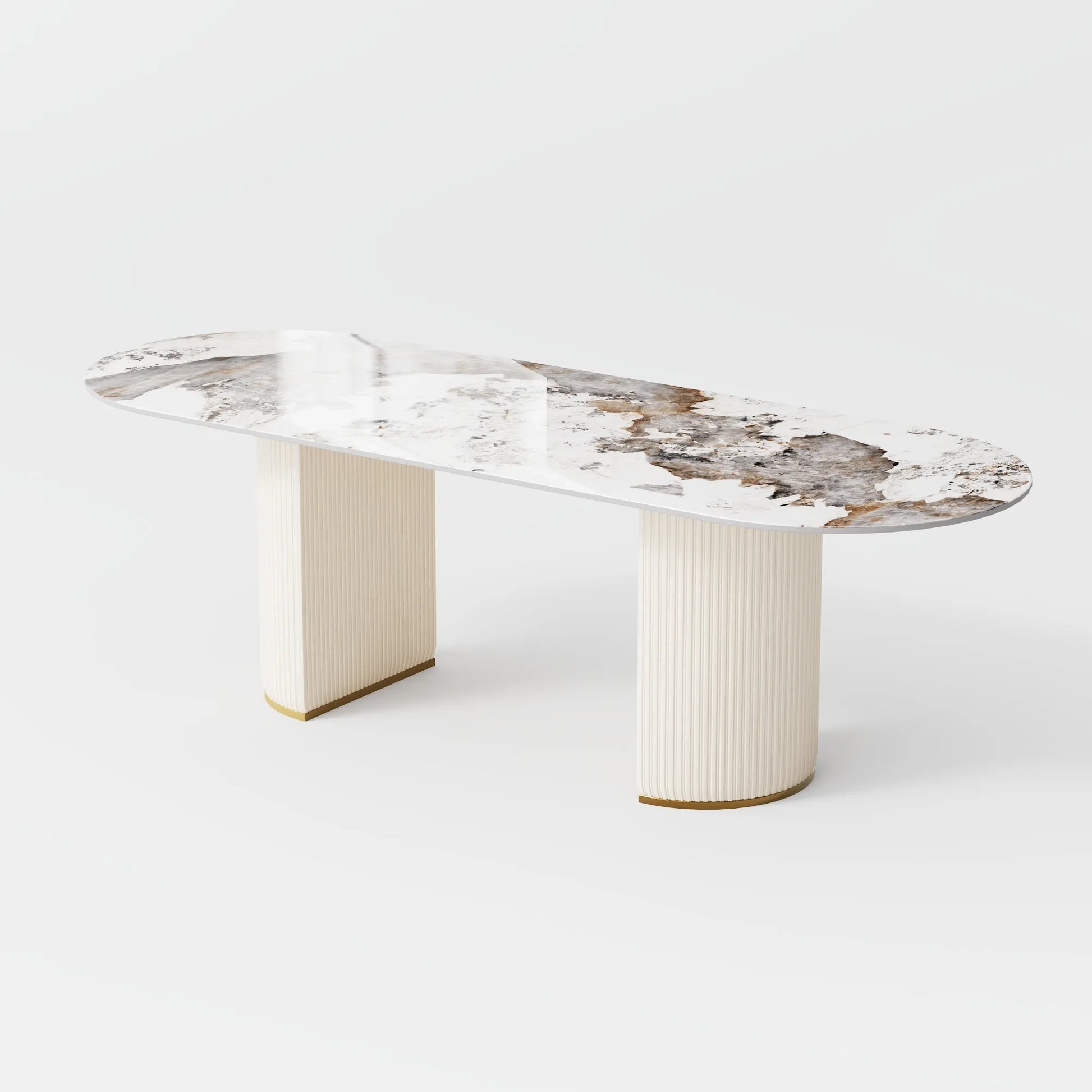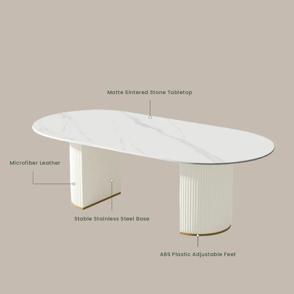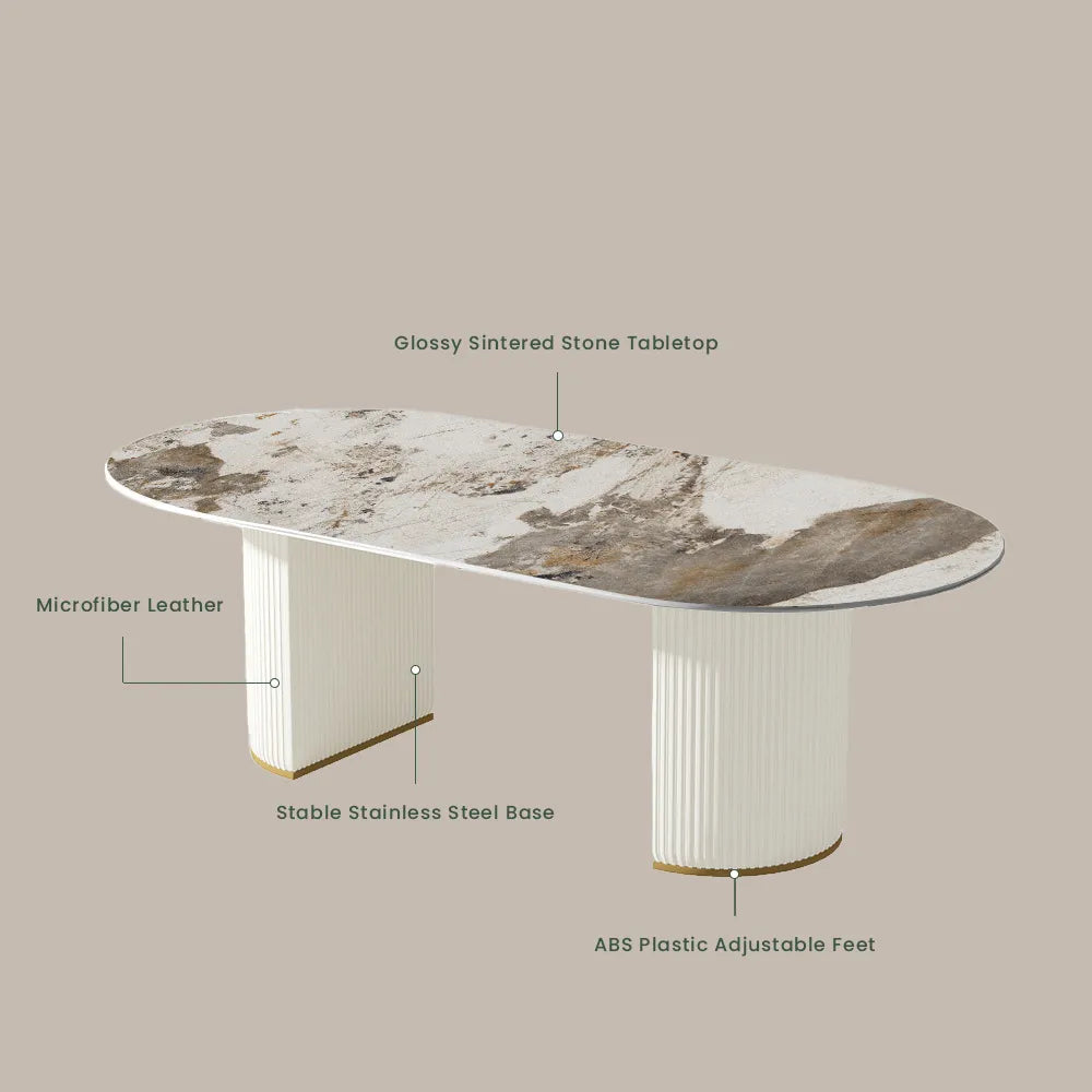 This white sintered stone dining table brings a sleek, spacious surface to your dining room or eat-in kitchen. It stands on a white base with a white-hued finish, and it has a tabletop with white, brown, and black veining. This table features a smooth oval surface with rounded corners, and it has thick, cylindrical legs for a sculptural silhouette. Streamlined with luxe details, it complements glam and contemporary decor style.