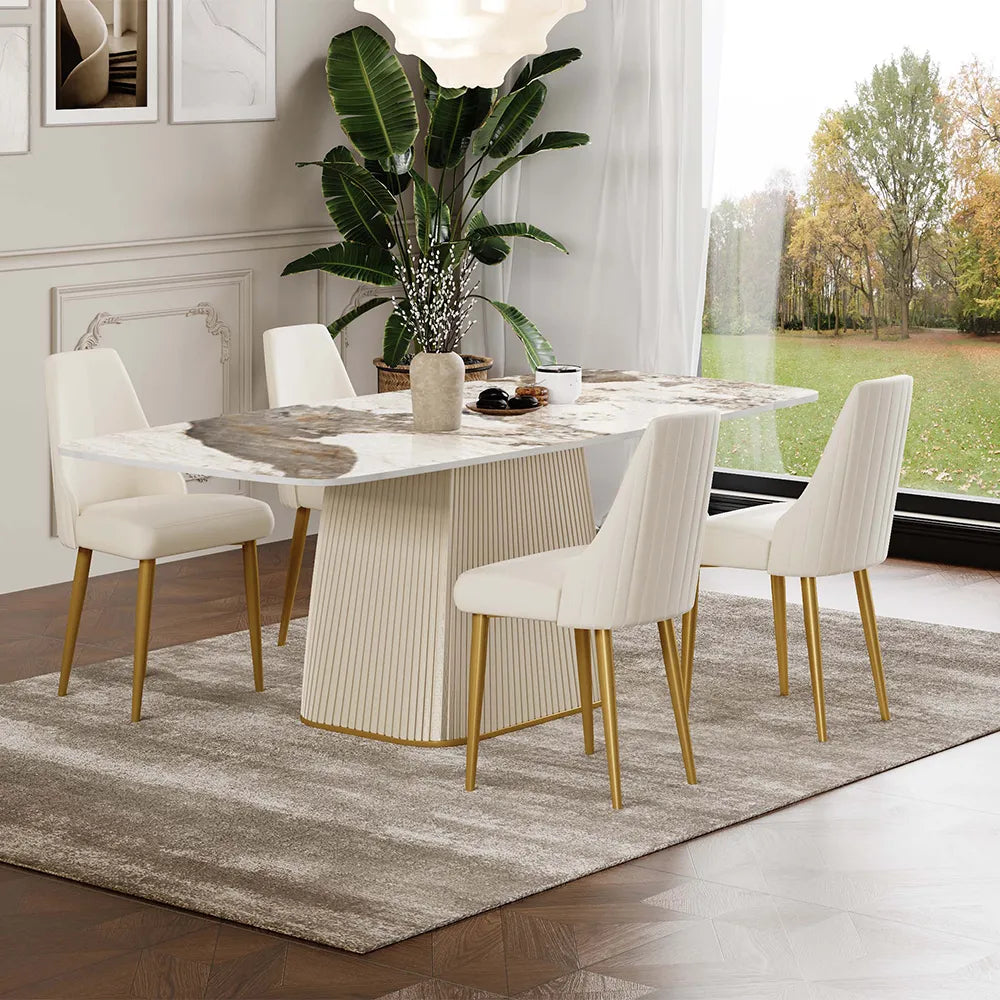 Modern restaurants must have this elegant white dining table, which will be the most dazzling of your restaurant. The sintered stone tabletop is covered with gray texture, which is full of artistic beauty. The widened metal base is well supported and very stable. Believe me, your friends will be surprised at this.