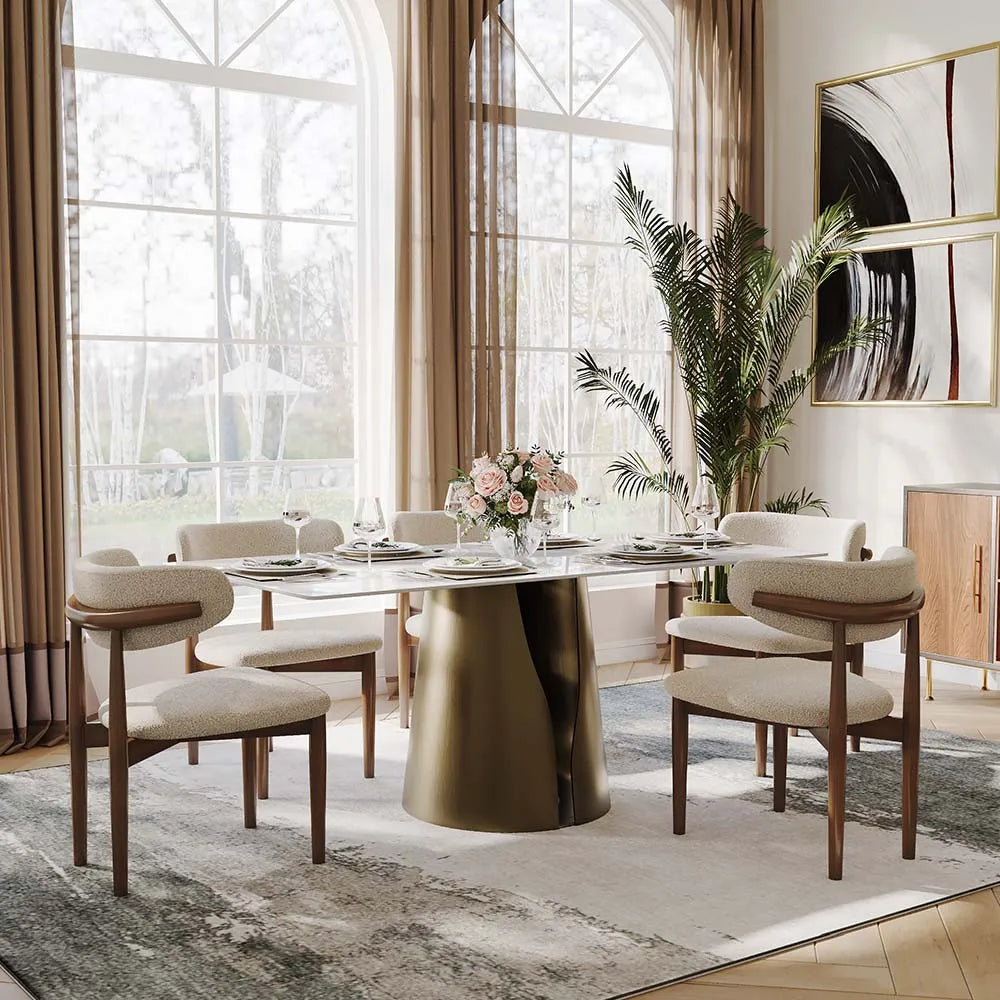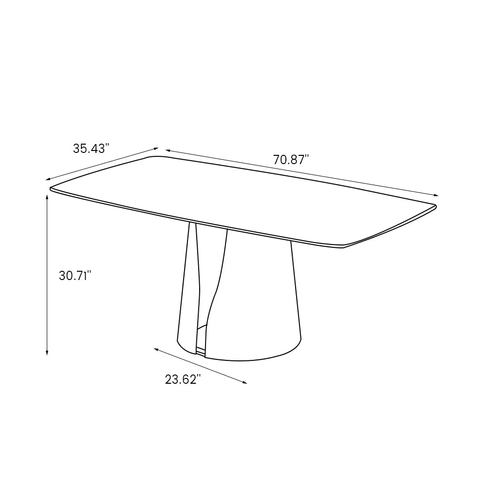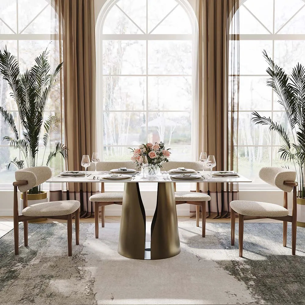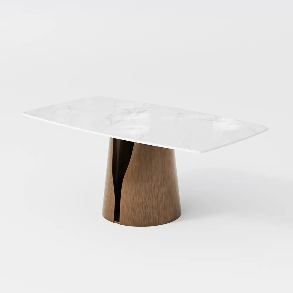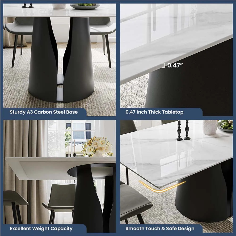 This table is durable and easy to clean, made from a solid piece of slate that resembles the look and feel of marble but is more robust, heat-resistant, and scratch-resistant. The sintered stone is non-porous, making it hygienic and easy to clean. The base is made of A3 carbon steel, known for its high hardness and rust resistance, commonly used in bridges and construction. The unique hollow design of the conical base is timeless. The spacious tabletop comfortably accommodates 6 people, providing a relaxed dining experience, perfect for entertaining friends and family for both casual and special occasions.
