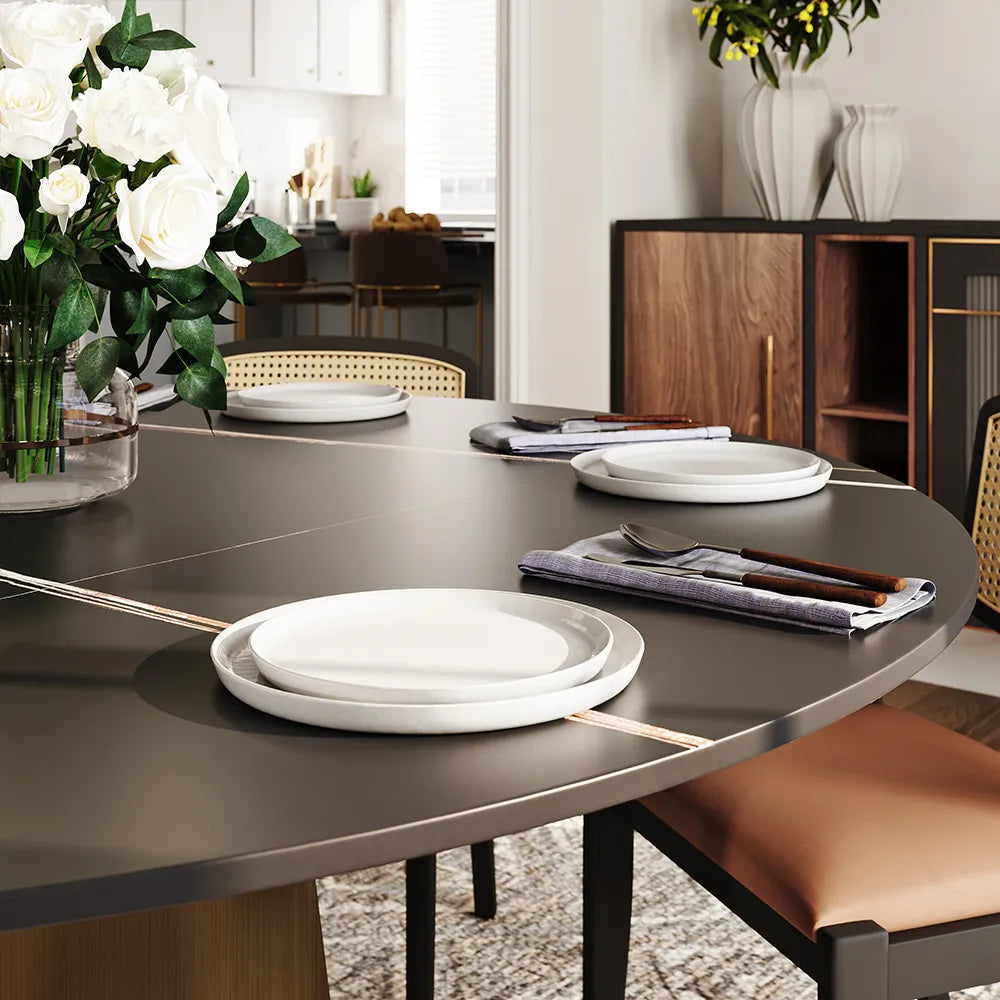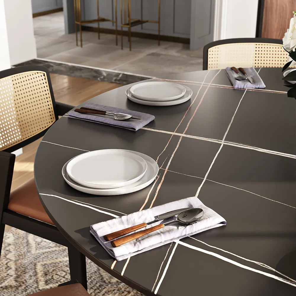 【Durable Dining Table & Easy to clean】One of the most sturdy surfaces, the tabletop is created from sintered stone that is heated and pressed into a leaf to provide you with a tabletop that will last for years. This material resists burns, stains, and scratches while also offering heat-resistant, fire-resistant, and anti-fouling properties.