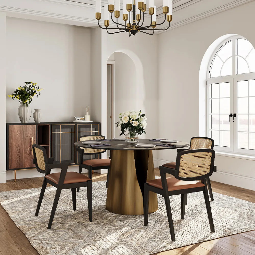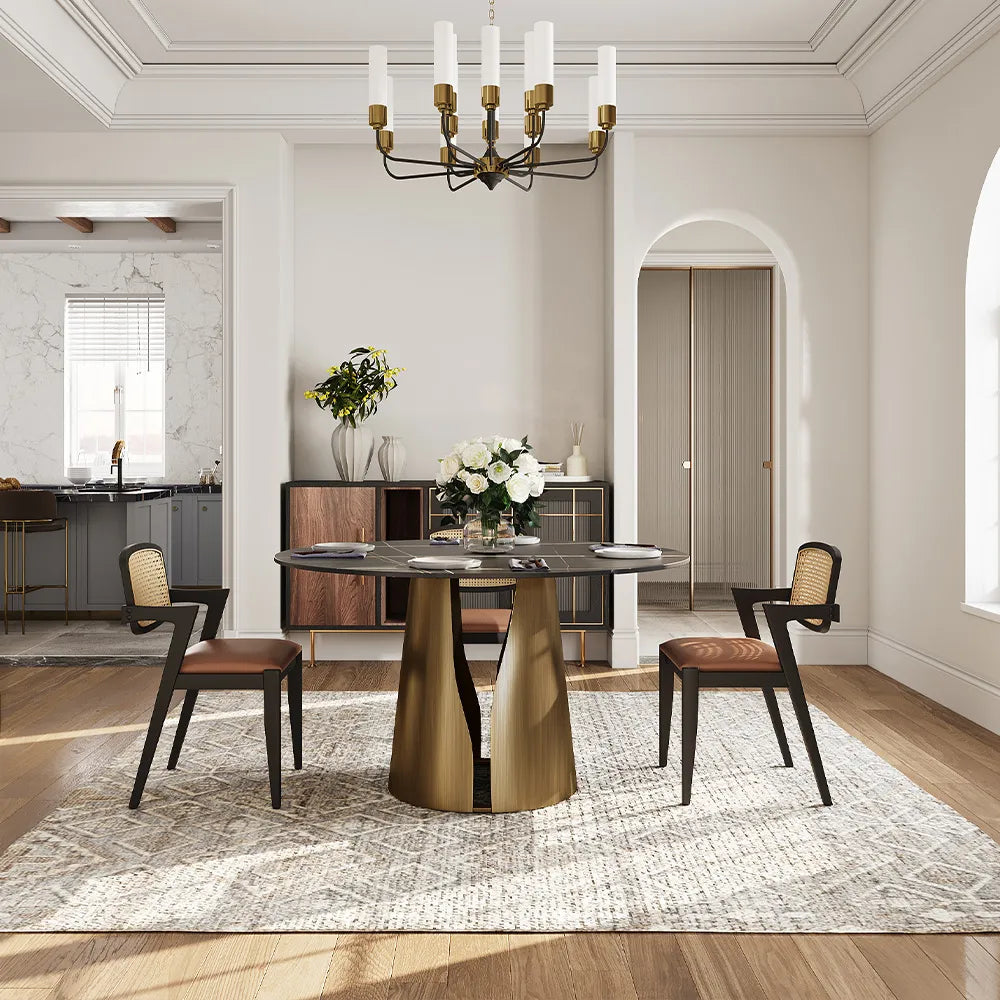 This modern round stone dining table with black sintered stone tabletop will be the heart of your entertaining ensemble, the leaf-shaped pedestal featuring a hollow-out design brings an artistic tone to the dining room.